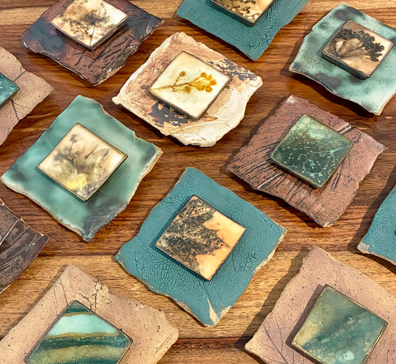 Sarah's mini seed tiles encompass delicate prints of seed pods, flowers, and/or cell-like structures encased in wax and mounted on a handmade ceramic tile. They whisper of the tiny yet powerful beginnings of life.