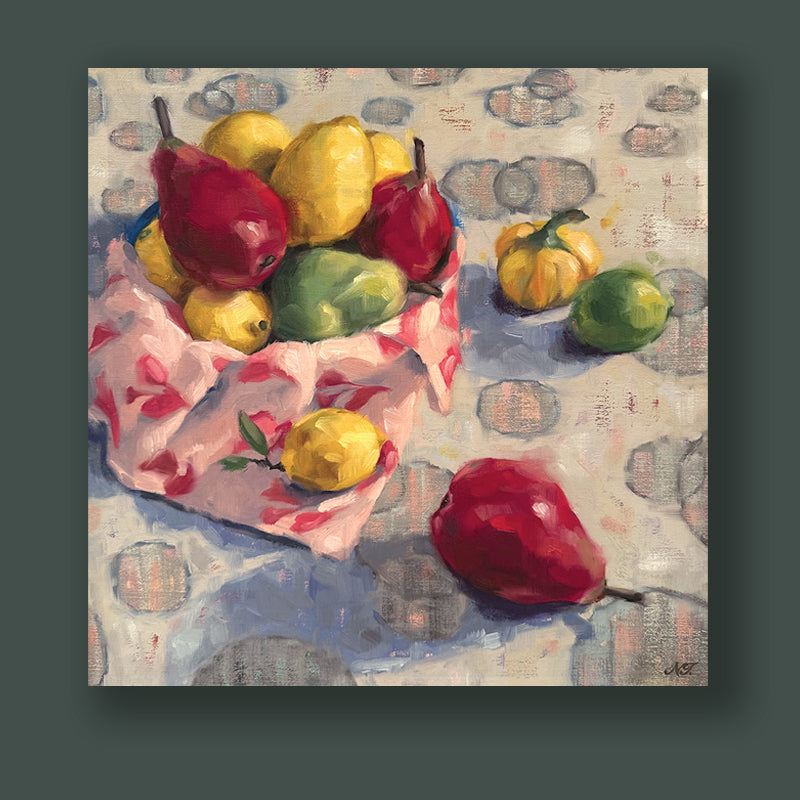 Ninalee Irani's Bright Harvest still life painting features a vibrant medley of pears, lemons, a squash, and a lime - perfect for adding a bit of brightness and joy to your kitchen or dining room.