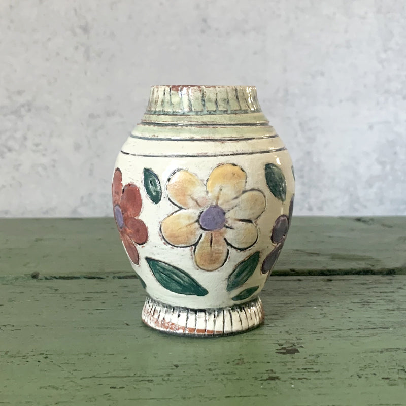 Handmade ceramic bud vase with multicolor flower decoration by Molly Lithgo. Made in NC.