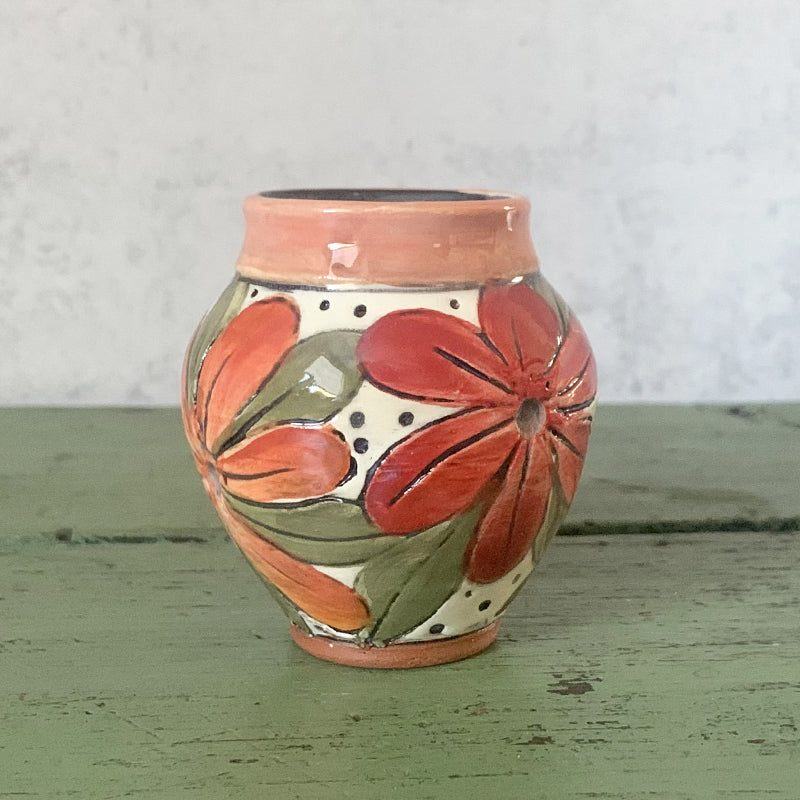 Mini handmade bud vase with orange and red flowers by Molly Lithgo. Made in NC.